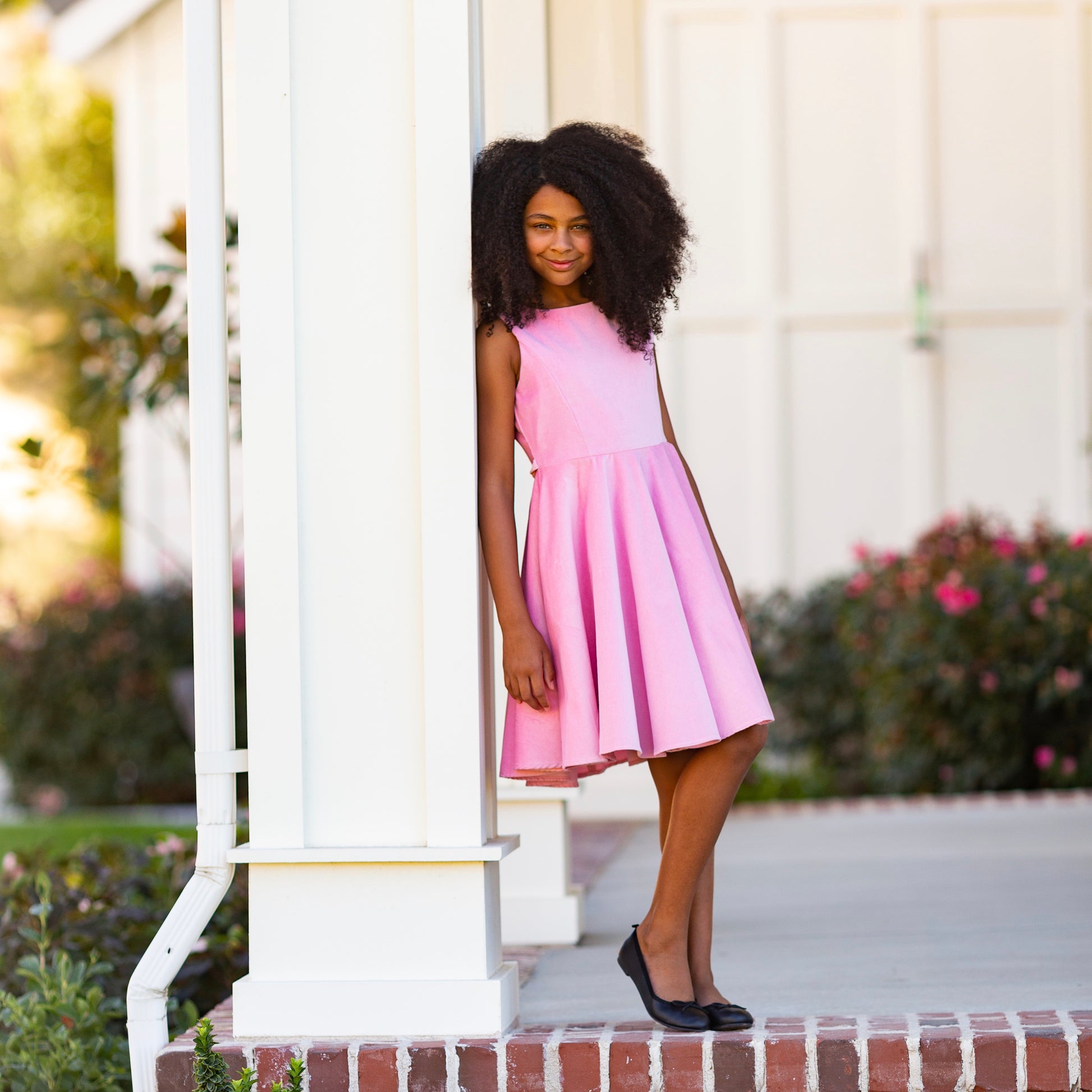 The skirt is cut on the bias making it a perfect twirler. The princess seam and back sash create a flattering feminine dress.